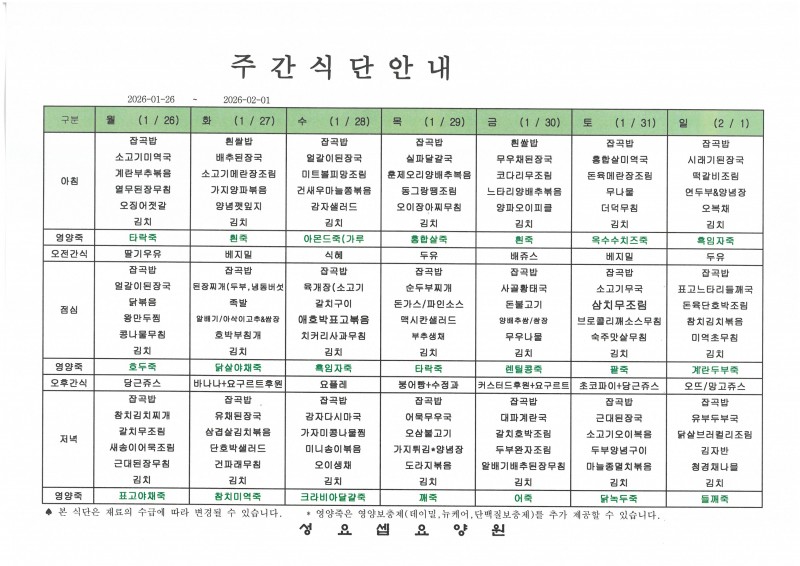주간메뉴(1월26일~2월1일) 페이지 정보 작성자 요양원지기 작성일26-01-27 09:39 조회10회 댓글0건 관련링크 다음글 목록 본문 주간메뉴(1월26일~2월1일) 댓글목록 등록된 댓글이 없습니다. 다음글 목록