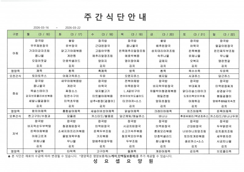 주간메뉴(3월16일~3월22일) 페이지 정보 작성자 요양원지기 작성일26-03-16 16:55 조회4회 댓글0건 관련링크 다음글 목록 본문 주간메뉴(3월16일~3월22일) 댓글목록 등록된 댓글이 없습니다. 다음글 목록