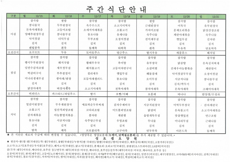 주간메뉴(12월15일~12월21일) 페이지 정보 작성자 요양원지기 작성일25-12-15 12:09 조회372회 댓글0건 관련링크 이전글 다음글 목록 본문 주간메뉴(12월15일~12월21일) 댓글목록 등록된 댓글이 없습니다. 이전글 다음글 목록
