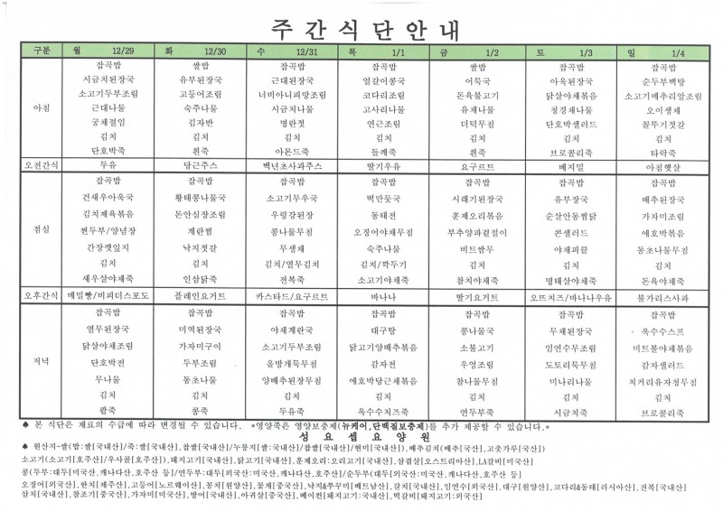 주간메뉴(12월29일~1월4일) 페이지 정보 작성자 요양원지기 작성일25-12-31 11:00 조회71회 댓글0건 관련링크 이전글 다음글 목록 본문 주간메뉴(12월29일~1월4일) 댓글목록 등록된 댓글이 없습니다. 이전글 다음글 목록