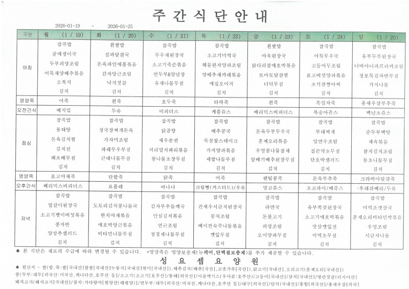 주간메뉴(1월19일~1월25일) 페이지 정보 작성자 요양원지기 작성일26-01-19 09:28 조회27회 댓글0건 관련링크 다음글 목록 본문 주간메뉴(1월19일~1월25일) 댓글목록 등록된 댓글이 없습니다. 다음글 목록