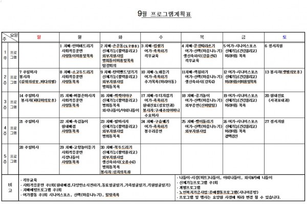 9월프로그램계획표 페이지 정보 작성자 요양원지기 작성일25-09-02 12:03 조회259회 댓글0건 관련링크 이전글 다음글 목록 본문 댓글목록 등록된 댓글이 없습니다. 이전글 다음글 목록