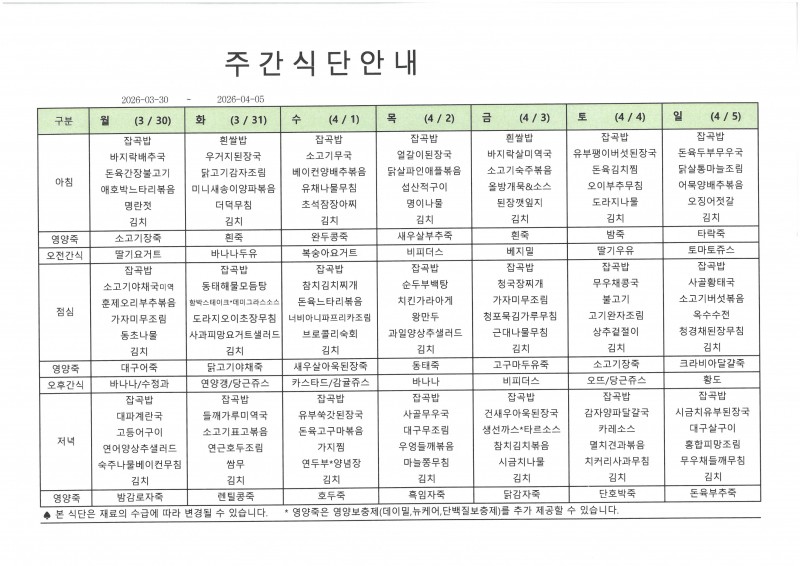 주간메뉴(3월30일~4월5일) 페이지 정보 작성자 요양원지기 작성일26-03-30 12:09 조회9회 댓글0건 관련링크 다음글 목록 본문 주간메뉴(3월30일~4월5일) 댓글목록 등록된 댓글이 없습니다. 다음글 목록