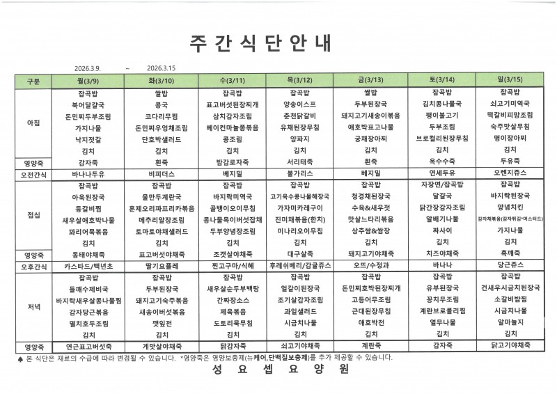 주간메뉴(3월9일~3월15일) 페이지 정보 작성자 요양원지기 작성일26-03-10 13:40 조회13회 댓글0건 관련링크 다음글 목록 본문 주간메뉴(3월9일~3월15일) 댓글목록 등록된 댓글이 없습니다. 다음글 목록