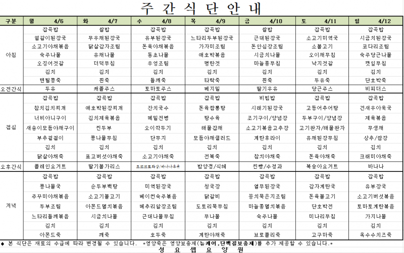 4월2주(4월6일~4월12일) 페이지 정보 작성자 요양원지기 작성일26-04-06 09:59 조회27회 댓글0건 관련링크 다음글 목록 본문 주간식단표 올립니다. 댓글목록 등록된 댓글이 없습니다. 다음글 목록
