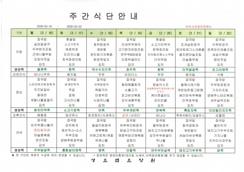 주간메뉴(2월16일~2월22일) 페이지 정보 작성자 요양원지기 작성일26-02-16 10:27 조회55회 댓글0건 관련링크 이전글 다음글 목록 본문 주간메뉴(2월16일~2월22일) 댓글목록 등록된 댓글이 없습니다. 이전글 다음글 목록