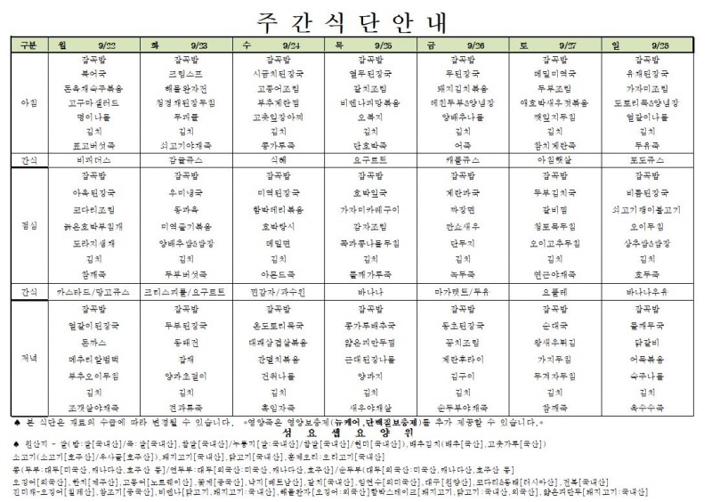 주간메뉴(9월22일~9월28일) 페이지 정보 작성자 요양원지기 작성일25-09-17 13:12 조회759회 댓글0건 관련링크 이전글 다음글 목록 본문 주간메뉴(9월22일~9월28일) 댓글목록 등록된 댓글이 없습니다. 이전글 다음글 목록