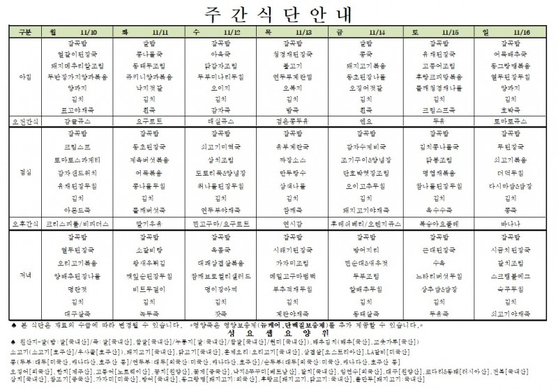 주간메뉴(11월10일~11월16일) 페이지 정보 작성자 요양원지기 작성일25-11-05 15:55 조회428회 댓글0건 관련링크 이전글 다음글 목록 본문 주간메뉴(11월10일~11월16일) 댓글목록 등록된 댓글이 없습니다. 이전글 다음글 목록