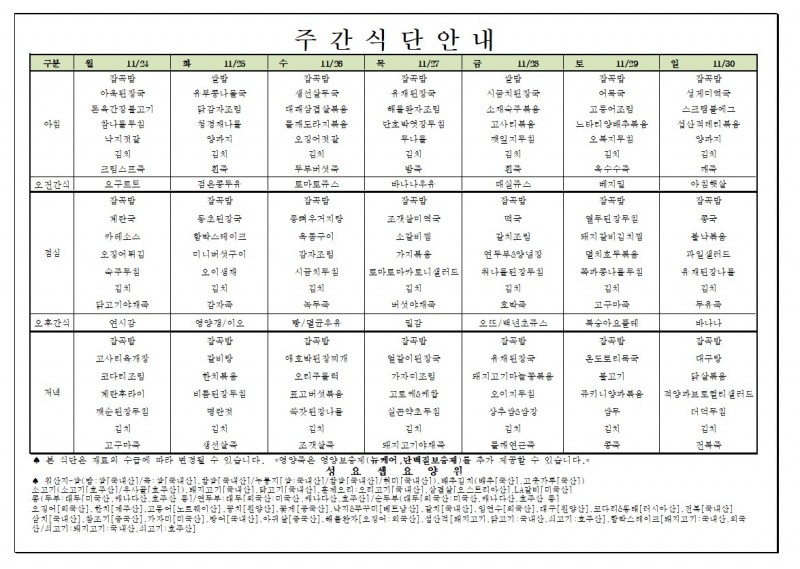 주간메뉴(11월24일~11월30일) 페이지 정보 작성자 요양원지기 작성일25-11-18 09:59 조회421회 댓글0건 관련링크 이전글 다음글 목록 본문 주간메뉴(11월24일~11월30일) 댓글목록 등록된 댓글이 없습니다. 이전글 다음글 목록