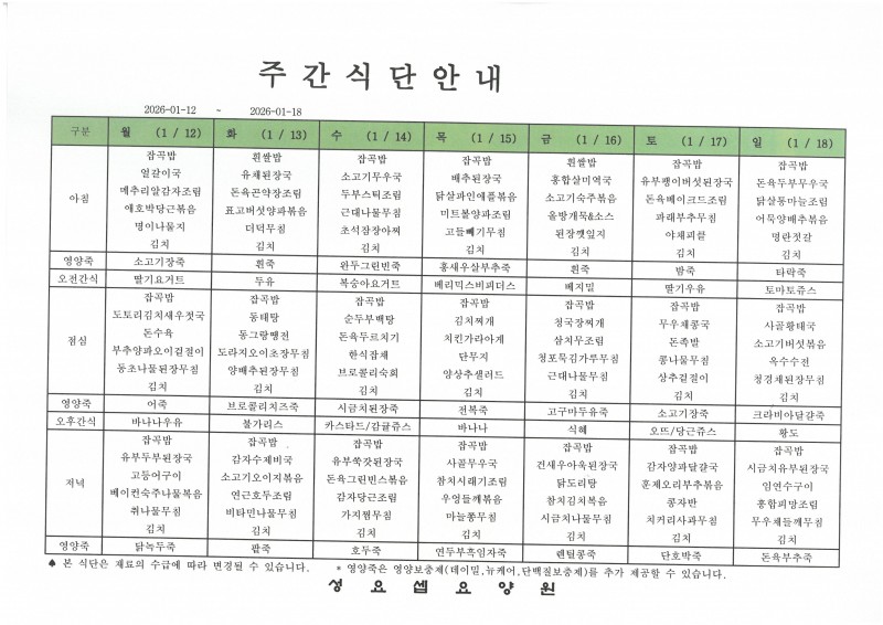 주간메뉴(1월12일~1월18일) 페이지 정보 작성자 요양원지기 작성일26-01-11 15:42 조회51회 댓글0건 관련링크 이전글 다음글 목록 본문 주간메뉴(1월12일~1월18일) 댓글목록 등록된 댓글이 없습니다. 이전글 다음글 목록